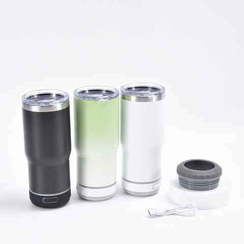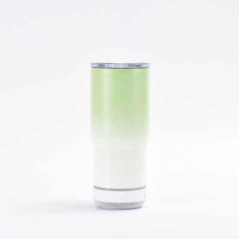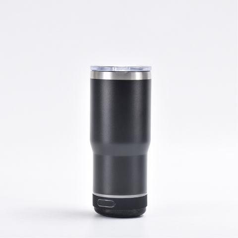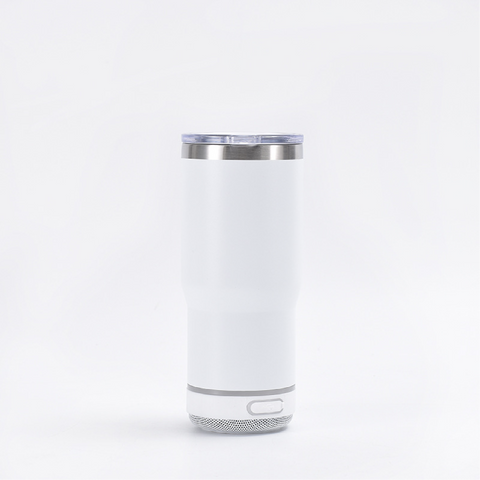 Coffee tumbler featuring a built-in wireless Bluetooth speaker