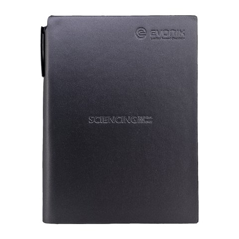 The notebook comes with a ballpoint-pen slotted in behind the book spine.